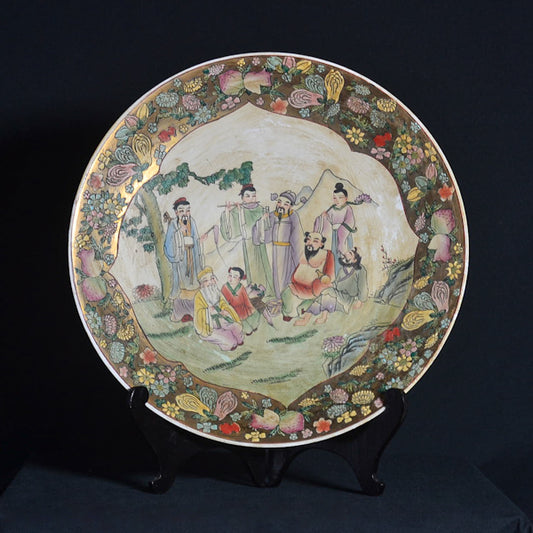 Coppia di grandi piatti cinesi in porcellana policroma con personaggi e paesaggio. Epoca primi ‘900