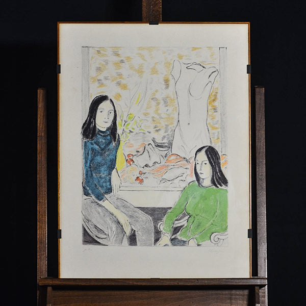 Questa opera di Francesco Menzio è un'affascinante rappresentazione artistica di vita quotidiana. Le due figure femminili hanno fogge dei primi anni ‘70 del ‘900, ultimi anni della sua attività artistica. La scena è ambientata in uno spazio indefinito ma è suggerito dalla ragazza sulla destra seduta su una sedia e dalla ragazza sulla sinistra appoggiata su una sorta di arredo cubico. Dietro di esse una finestra che si affaccia su un giardino dove è posta una erma (un busto marmoreo), rendendo il quadro ancor più enigmatico. La sua pittura interiore e raffinata con frequenti manifestazioni malinconiche evidenzia un uso del colore intenso e tenue allo stesso tempo, con elementi riconducibili alle opere di Modigliani e Matisse. L’opera presenta una dedica in basso a sinistra all’amico Cerino ed è firmata Menzio in basso a destra. Francesco Menzio (Tempio Pausania 1899 - Torino 1979). Tecnica mista su cartoncino.
