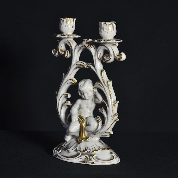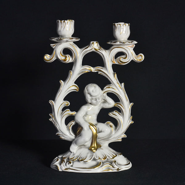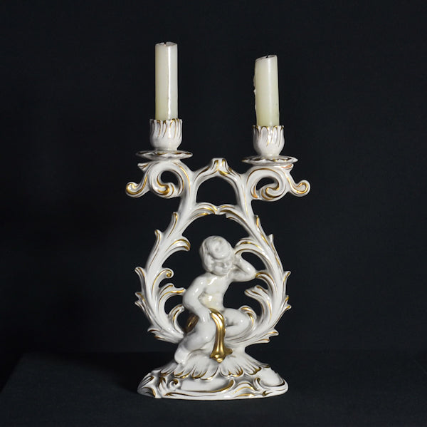 Candeliere a 2 fiamme in porcellana bianca e rifiniture dorate raffigurante un amorino
