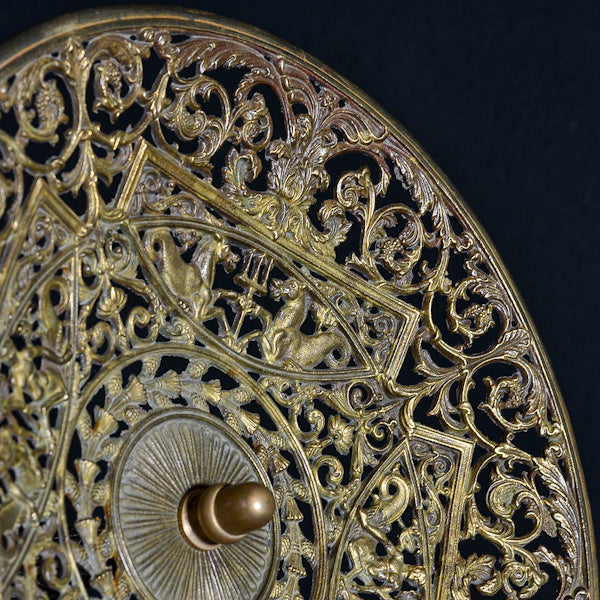 Il centrotavola in bronzo lavorazione a traforo di fine '800 è un simbolo dell'abilità artigianale di quel periodo: motivi intrecciati, disegni floreali, tridenti accompagnati da cavallucci marini arricchiscono la superficie del centrotavola con un'elegante e sofisticata trama. È un oggetto affascinante e prezioso, capace di catturare l'attenzione di chiunque lo incontri e di aggiungere un tocco di eleganza e storia ad ogni ambiente in cui viene esposto.