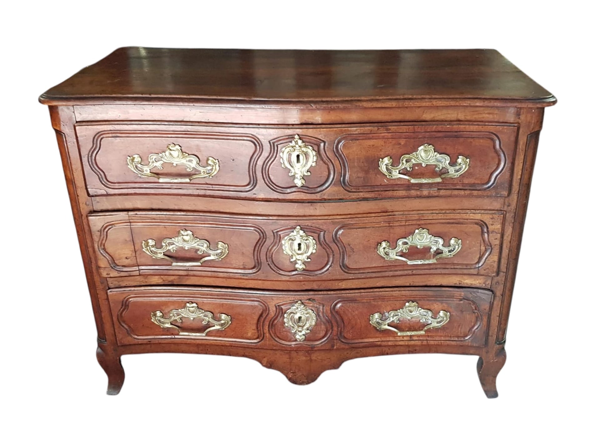 Comò in stile Luigi XV° in legno di noce con tre cassetti, maniglie e bocchette in bronzo