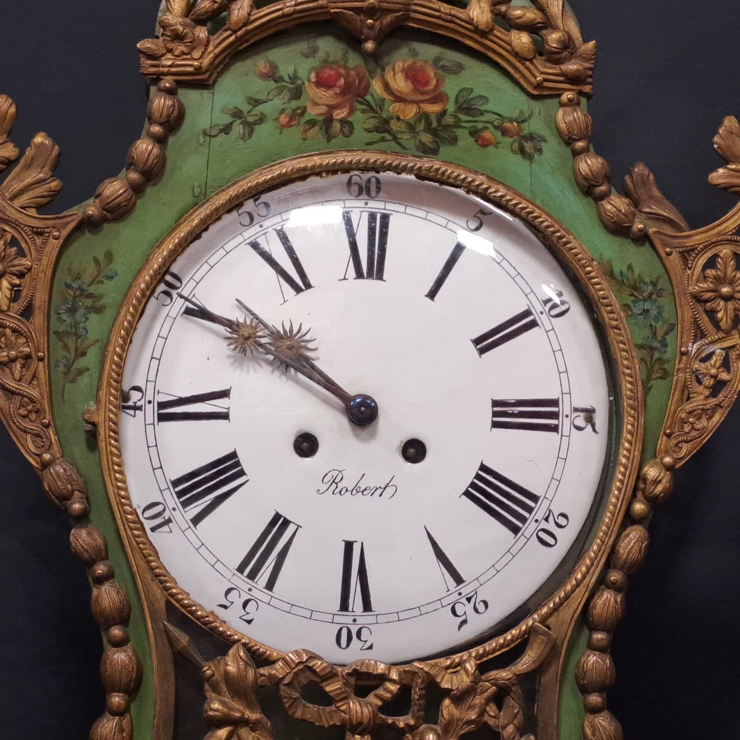 Grande orologio da parete "Robert Cartel" laccato verde e bronzo dorato con base supporto .Il quadrante è in smalto bianco con numeri romani e arabi. Epoca 700