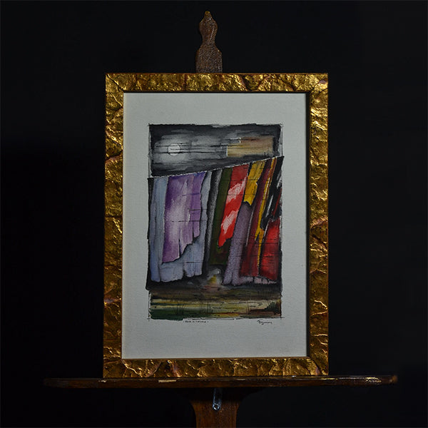 Questo vivido guazzo cattura l'occhio con la sua rappresentazione di panni colorati stesi all'aria aperta sotto la luce della luna. Lo sfondo misterioso dell'atmosfera notturna crea contrasto con i colori vivaci dei tessuti. La firma "Fregonara" in basso a destra contribuisce a conferire all'opera un senso di autenticità e connessione con l’artista, aggiungendo una dimensione personale. La cornice si sposa perfettamente con lo stile dell’opera, moderna ma impreziosita dalla doratura.