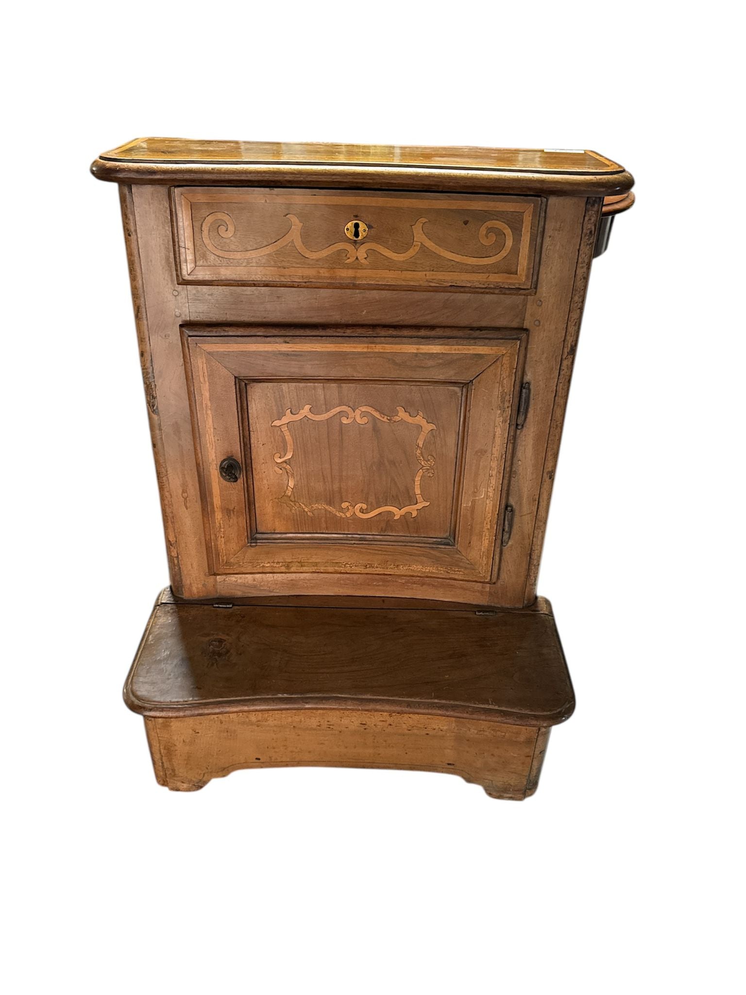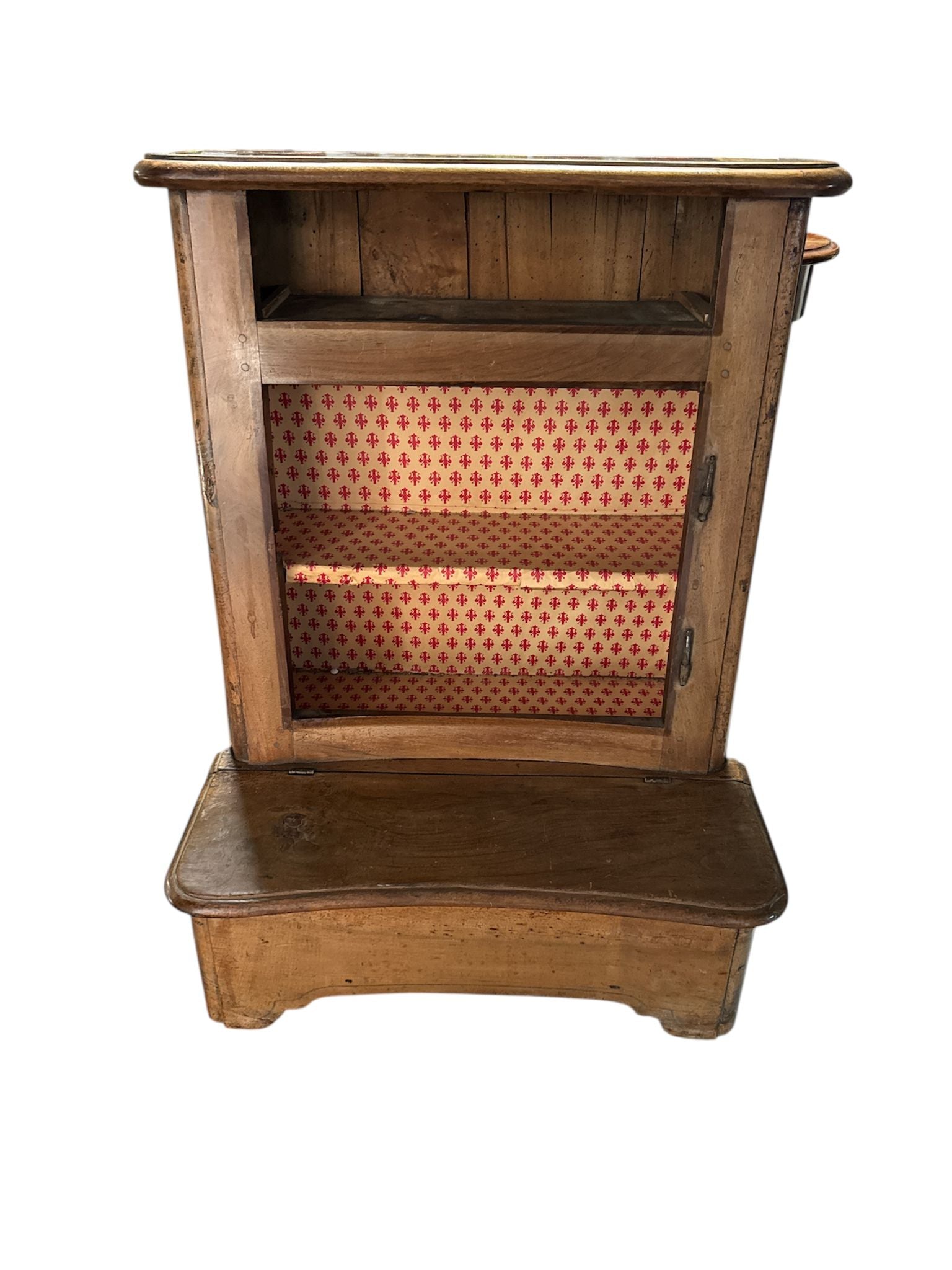 Inginocchiatoio in legno di noce e pioppo con anta centrale, un cassetto sotto piano e una pedana sollevabile con vano