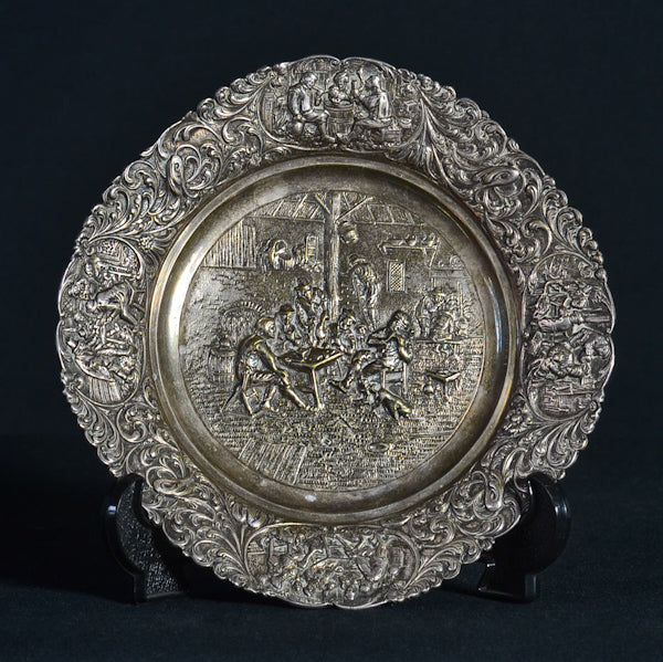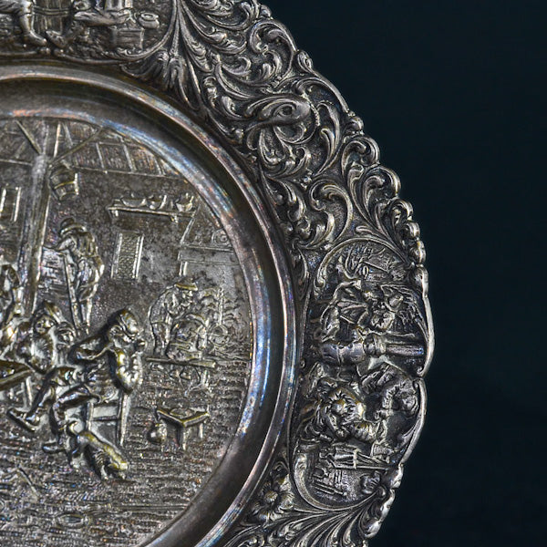 Piatto in metallo argentato con scene in rilievo. Fine XIX secolo. Area fiamminga